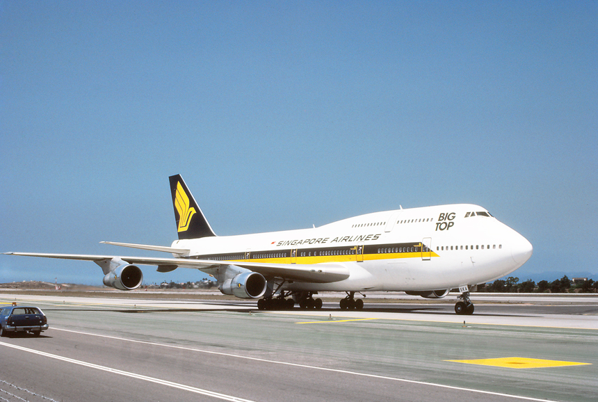 August 1983* Singapore Airlines spent many years during the 1970s trying to secure rights to start service to the United States as part of its planned expansion. Service to San Francisco was finally started in July 1979. Los Angeles was added on July 2, 1980 using their brand new Boeing 747 "Super-Bs" on the thrice-weekly Singapore-Taipei-Honolulu-Los Angeles service. Within a few years the Boeing 747-300 was placed on the now one-stop Singapore-Tokyo-Los Angeles routing. Seen taxiing back to the terminal along Taxiway Uniform after a trans-Pacific flight is, 9V-SKA, a Boeing 747-312. |
