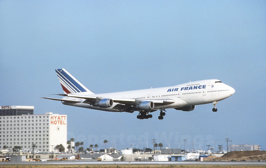 July 1983* Air France introduced their well recognized "tri-color" logo was introduced in 1976 to help celebrate the introduction of the famed British Aerospace Concorde. The colors combined the elements of the French national flag and wings of the hippocampus, a symbol used by the airline beginning in 1933. During the early 1980s Air France had increased service to Los Angeles from Paris Charles de Gaulle to six times weekly using the Boeing 747s. Seen over-the-numbers for landing on Runway 24 Right during an evening arrival from Paris is Air France Flight 003, a Boeing 747-228BM, registered F-BPVT and delivered new to airline on September 30, 1977. |