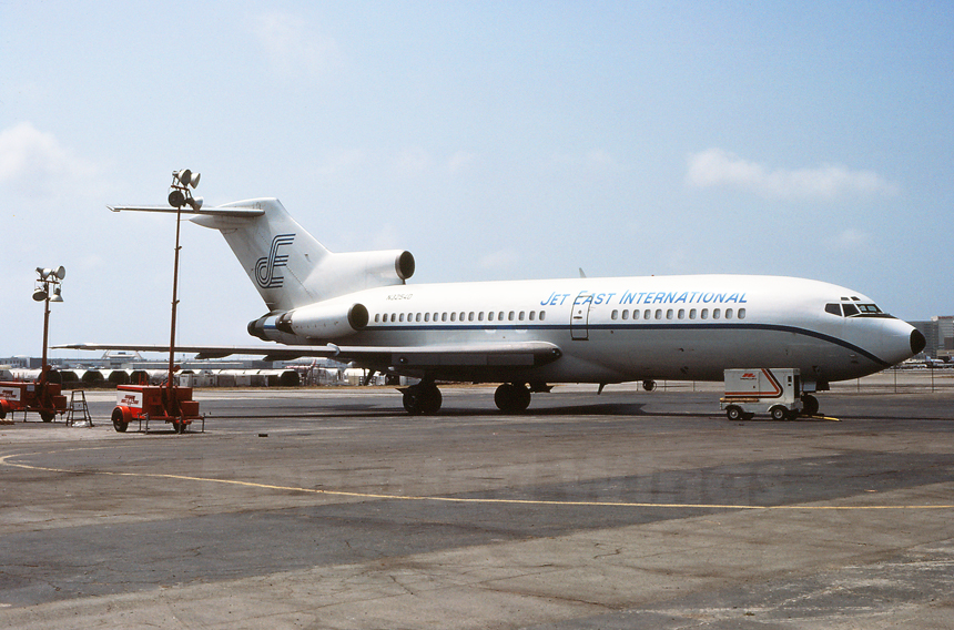 July 1983* Jet East International was established in early 1983 as a contract and charter cargo airline based in Austin, Texas. A single Boeing 727 was initially purchased in 1983 to provide air cargo service for DHL Airways. Eventually Jet East International would operate over twenty Boeing 727s in various cargo and passenger charter configurations. Seen parked on the south cargo ramp is N3254D, a Boeing 727-155(C), originally delivered to Executive Jet Aviation in 1967. |
