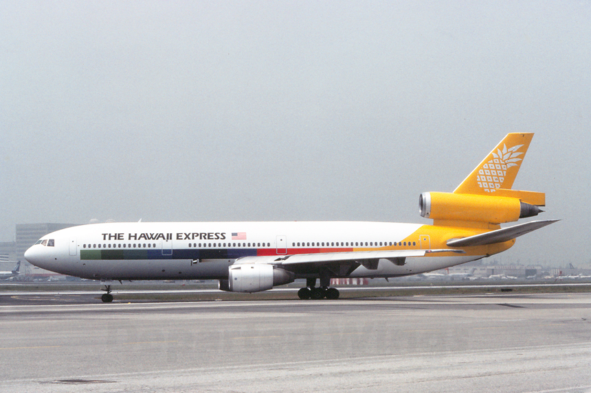 June 1983* After only six months of operations and with fierce competition in the Los Angeles-Honolulu market with the likes of established carriers such as Western Airlines, Continental Airlines, and Northwest Orient, The Hawaii Express traded in the Boeing 747 for a pair of Douglas DC-10s in April 1983. With the two smaller aircraft the airline was able to increase service to three daily round-trips, as well as planning to expand with additional destinations. Seen approaching Runway 25 Right for a morning departure under overcast skies is N905WA, a Douglas DC-10-10, being leased from International Air Leases on April 5, 1983. |