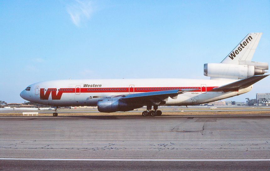 July 1983*By 1983, Western Airlines was operating a fleet of eleven Douglas DC-10s on its more dense services. Los Angeles was seeing the "Heavy 10" on scheduled flights to Honolulu, Salt Lake City, Seattle, and Vancouver, Canada. Seen taxiing toward Runway 24 Right for an evening departure is N914WA, a Douglas DC-10-10, delivered new to the airline on May 12, 1980. |